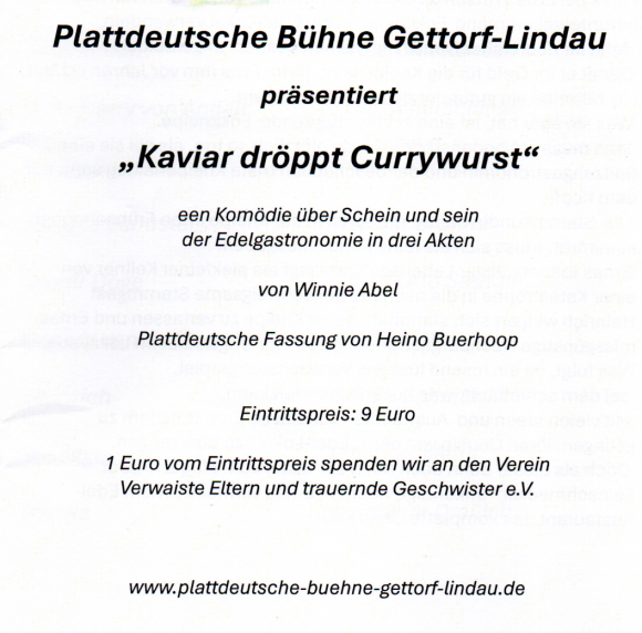 Wi söken: jümmers Lüüt, de Spooß an't Theoterspeelen un de plattdüütsche Spraak hebbt. Wokeen Lust dorto hett kann sick bi Knud Matthießen Tel. 04346/369129 mellen